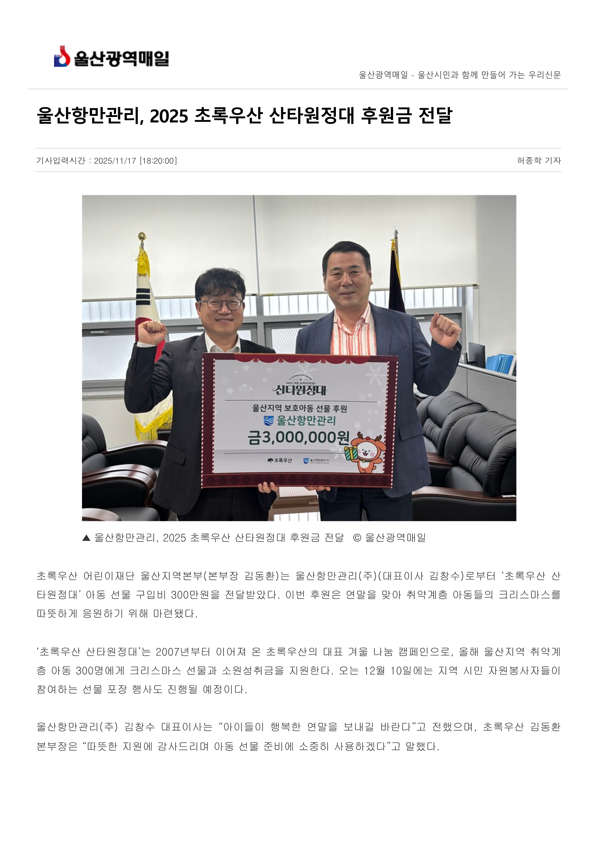 - 울산항만관리, 2025 초록우산 산타원정대 후원금 전달(2025. 11. 17.)